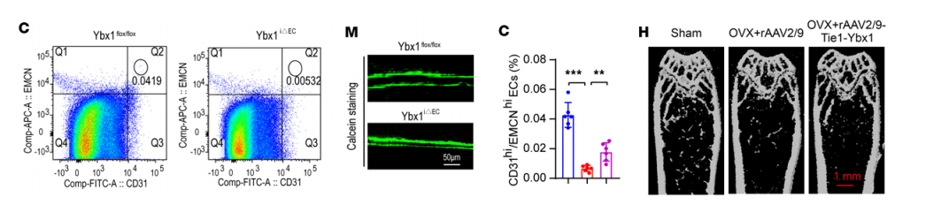 流式细胞仪定量分析证实了OVX诱导的CD31hiEMCNhi ECs的减少,而在Ybx1iOE-EC小鼠中EC数量的增加。