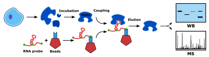 针对目标区域设计生物素标记的特异性RNA探针偶联磁珠,并与细胞蛋白提取物孵育,蛋白分子与RNA探针特异性结合,经洗脱,得到目的RNA探针-蛋白质复合物。最后采用Western Blot或质谱鉴定蛋白质类型。