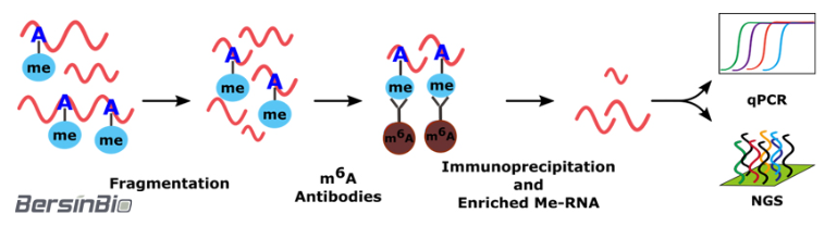 MeRIP利用m5C/m6A/m7G特异性抗体识别并结合mRNA上的m5C/m6A/m7G甲基化修饰位点,以RNA免疫共沉淀方法富集甲基化修饰片段,同时,结合高通量测序与qPCR,在全转录组范围内研究发生m5C/m6A/m7G甲基化修饰的RNA区域,及其对基因表达的调控作用。
