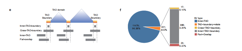 具有破坏染色质折叠潜力的SV(即跨越TAD边界或部分重叠的变异)表现出独特的SV类型组成,其中跨越边界的事件以缺失为主。