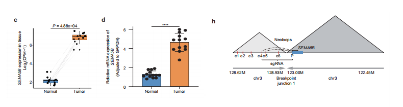 为探究SEMA5B过表达的调控机制,我们基于neo-loop结构坐标鉴定了参与异位相互作用的增强子(e4–e6)。