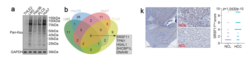 KAT2A驱动 HCC 中致癌性SRSF11蛋白K419位点的琥珀酰化修饰。全局琥珀酰化检测显示,与THLE2细胞相比, HCC 细胞系存在显著的过度琥珀酰化现象。
