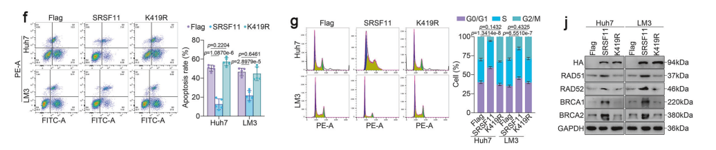 克隆形成实验、细胞凋亡、细胞周期、彗星实验及 γH2AX 焦点分析表明,野生型SRSF11(而非K419R突变体)能显著增强DNA损伤修复能力与放射抗性。