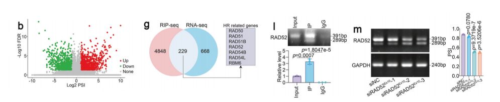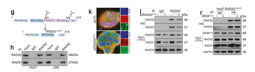 此外,RIP实验进一步验证了SRSF11与RAD52的直接结合。为进一步验证RAD52是SRSF11的直接下游功能靶点,我们设计了特异性靶向RAD52第10外显子的siRNA(siRAD52Ex10)。