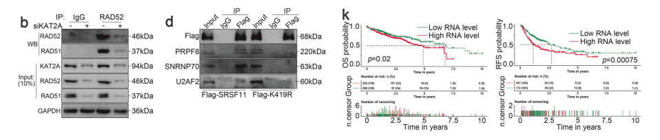 这些基因的表达还与RAD51和RAD52的表达呈正相关。由此我们推断,KAT2A介导的K419琥珀酰化作用促进了SRSF11相关剪接体的形成。