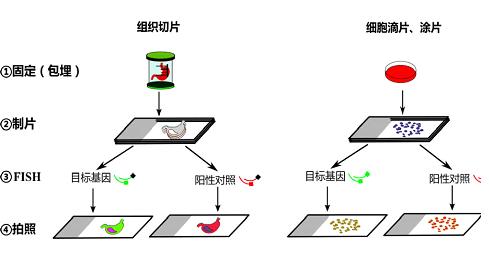 将经荧光素标记的寡核酸探针与变性后的染色体、细胞或组织中的核酸按照碱基互补配对原则进行杂交,再经变性、退火、复性、洗涤后,形成靶 DNA与核酸探针的杂交体,最后,在荧光显微镜下显影,从而对待测 DNA 进行定性和定位分析。