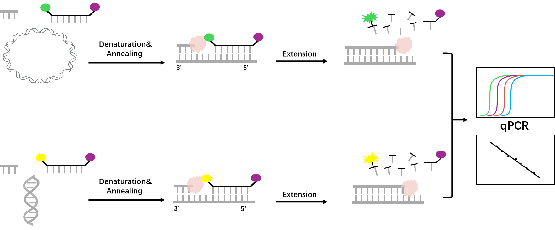 本试剂盒采用Taqman probe qPCR方法特异性扩增样本mtDNA与核基因组DNA,通过建立标准曲线,对线粒体拷贝数进行定量。