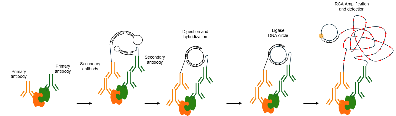 ③邻近连接(DNA 连接酶催化):加入连接酶:仅当探针 1 与探针 2 距离足够近(<40 nm)时,二者的互补 DNA 序列可通过碱基配对形成局部双链,被连接酶连接成一个完整的 DNA 环。若蛋白 A 与 B 不互作(距离过远),探针无法靠近,连接反应不发生。